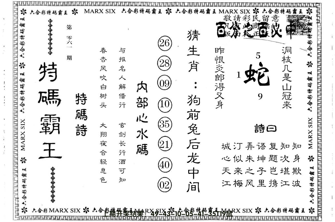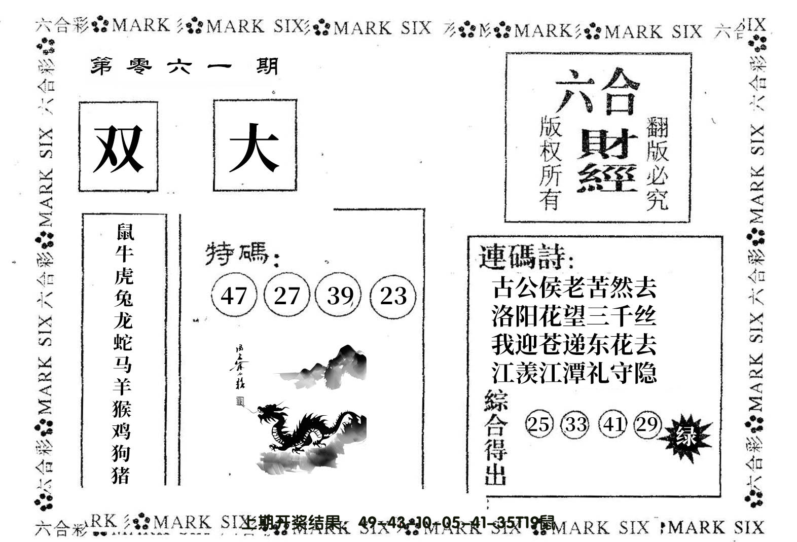 11,12,19,20,27,28,41,42,49 龙 冲 狗 蛇 冲 猪 13 14 15 16 17 18 19 20 21 22 23 24